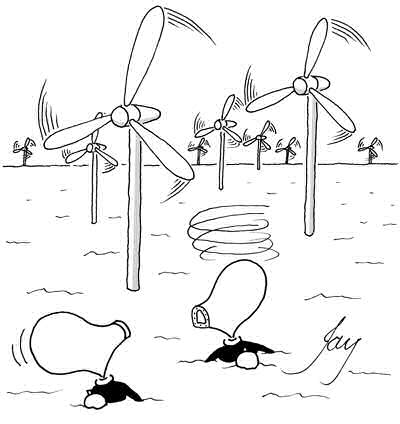 Due to the global warming phenomenon, it appears that we are suffering increasingly from a lack of wind. To save the nation from chronic doldrums, the Government is establishing offshore windfarms. Large numbers of wind generators are being strategically placed around the coast to maintain our wind-swept heritage.